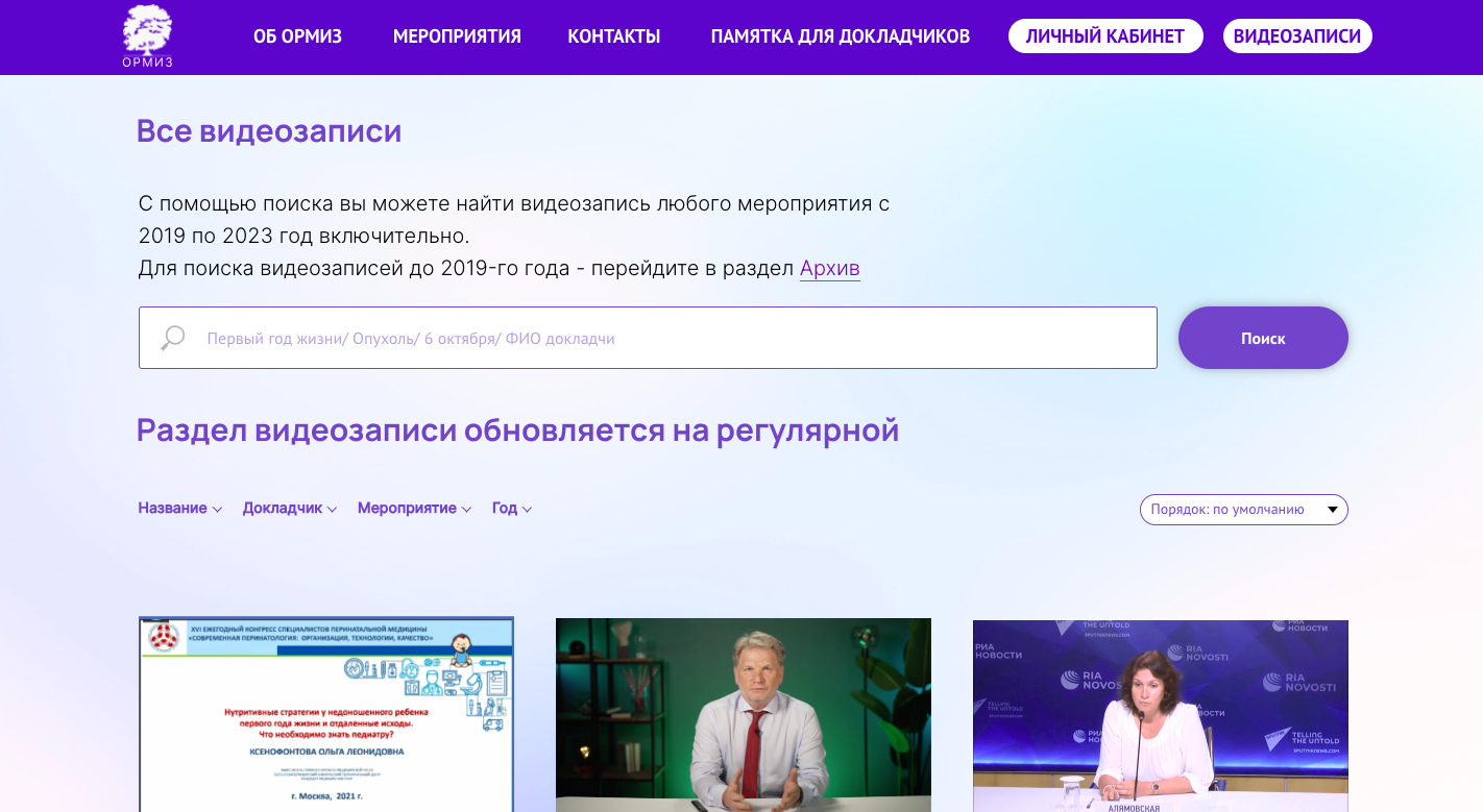 Также я реализовала раздел «все видеозаписи», где можно посмотреть записи всех прошедших конференций, воспользовавшись фильтром по темам, датам, докладчикам или ключевым словам.