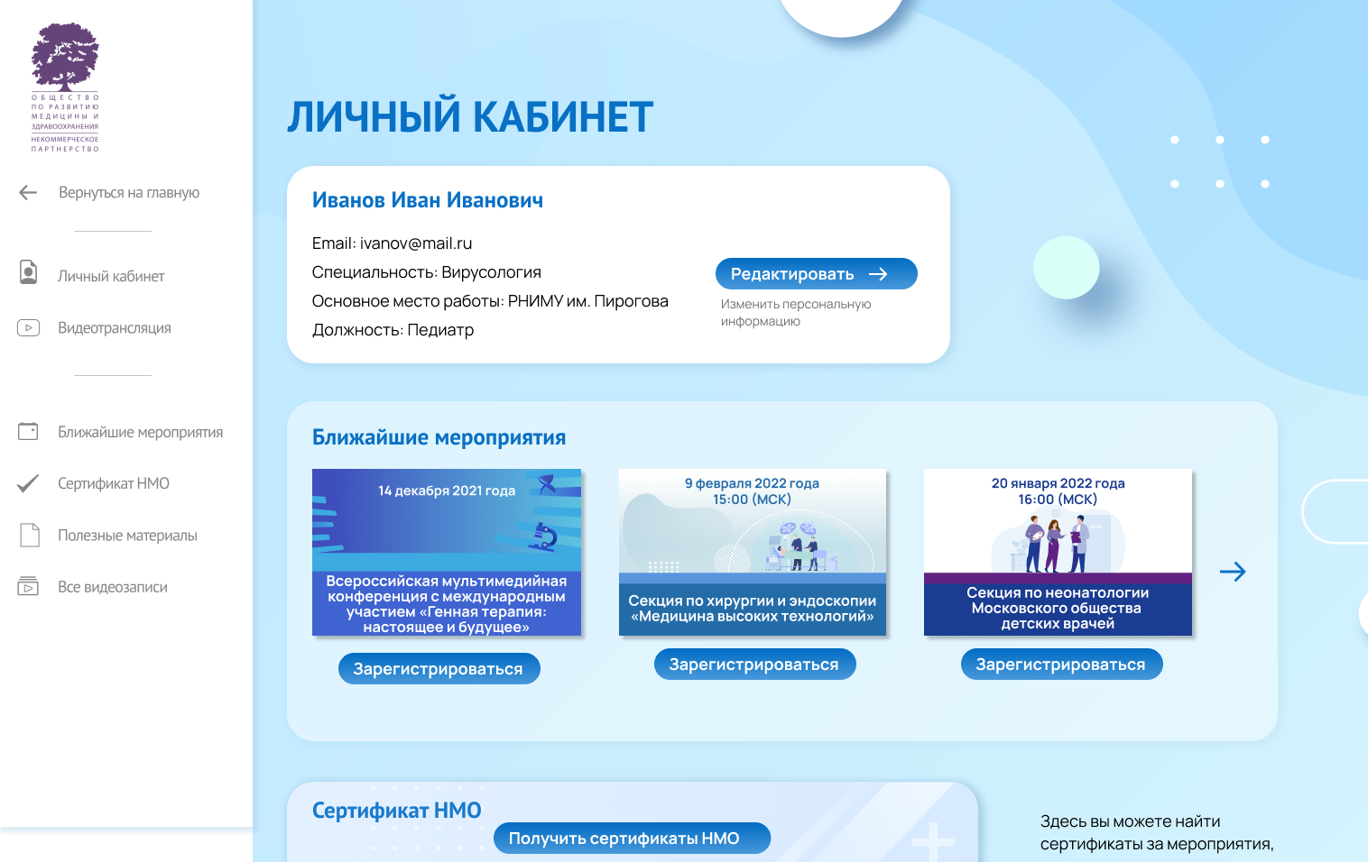 Изменила внешний вид личного кабинета. Внутри понятная навигация по разделам, возможность сохранять полезные материалы, которые предоставляют лекторы во время конференции. Также реализовала удобный поиск сертификатов участника по названиям конференций и по году.